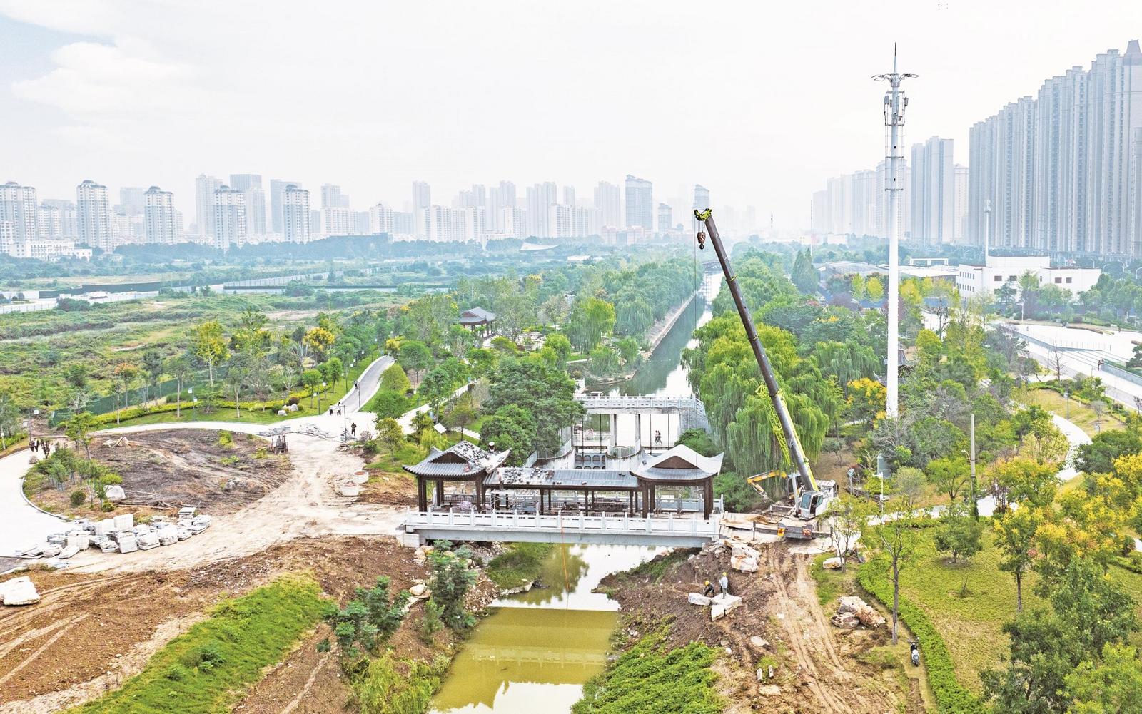 9月25日,苏州大运河废墟公园的风和雨桥的航空摄影正在建设中。覆盖的桥位于公园的尽头,该公园宽敞,该公园位于东侧的彩虹桥上。桥梁的建筑风格完全反映了Sui和Tang王朝期间中国古代建筑的本质。完成后,它将为参观公园的公民提供一个享受现场并放松身心的好地方。记者的图片Ma冯的图片